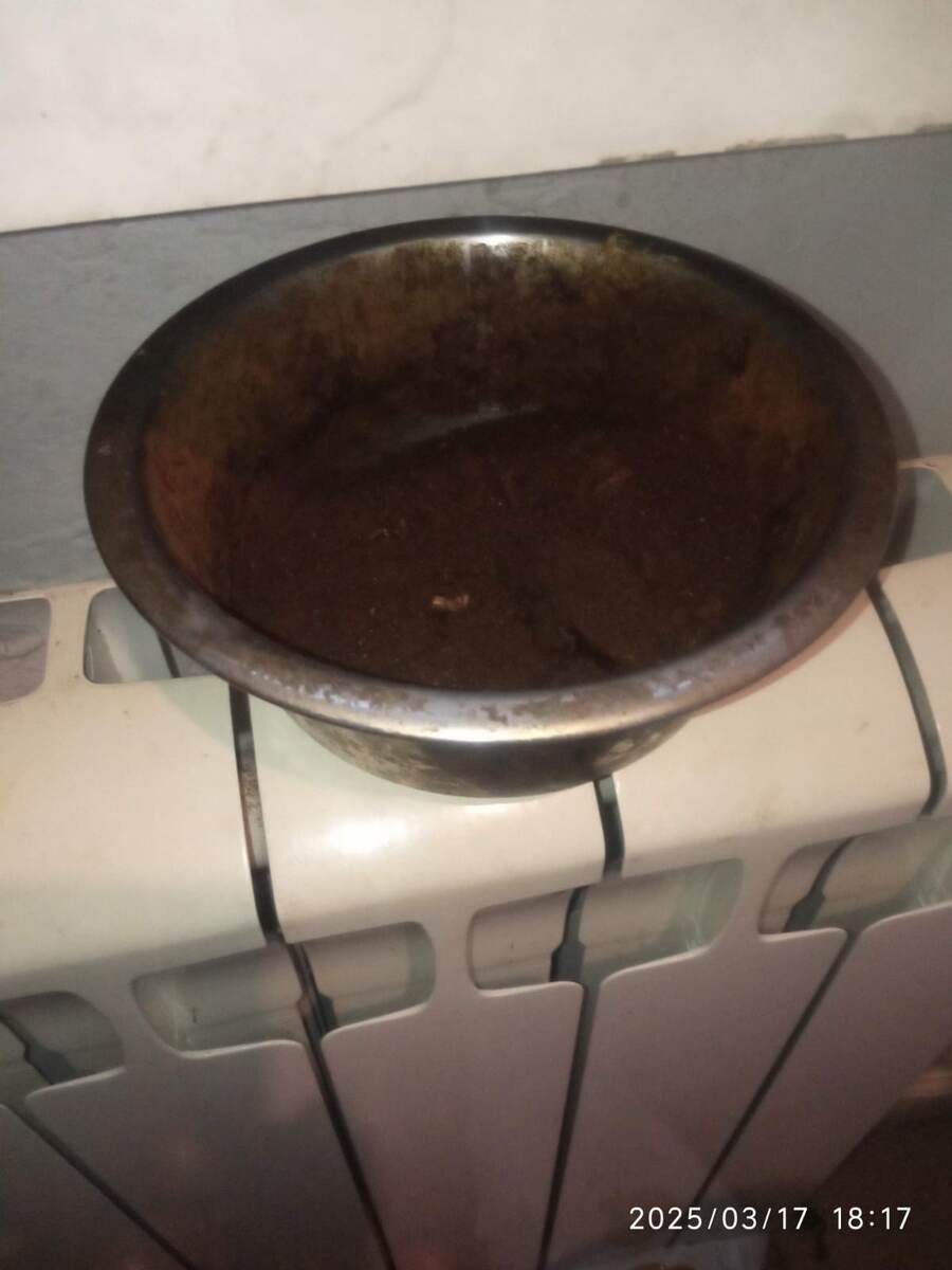 Чеснок - одна из самых неприхотливых, простых в выращивании и уходе культур. Посадил в октябре в подготовленную грядку, приезжаешь в апреле-мае на дачу, а он уже растёт и радует этим своих хозяев. Но как сохранить чеснок, чтобы он не усох, не почернел, не пустил корни и не пошёл в стрелку? Известен способ хранения в трёхлитровых банках, но и в них часть нашего урожая портилась, как описано выше. В банках с закрытой крышкой, чеснок пускал корни, в открытых - усыхал. Муж пробовал добавлять песок, но это тоже провоцировало рост корней и стрелок. И тут моему мужу пришла в голову мысль использовать остатки от сваренного кофе. Мы по утрам пьём по чашечке кофе, а оставшийся жмых перекладываем в металлическую миску и досушиваем на батарее центрального отопления вот так: