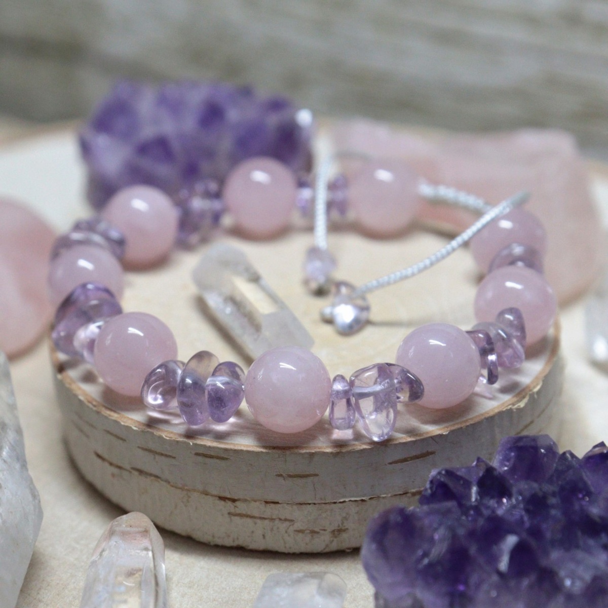 Браслет "Волшебство лепестков" из розового кварца и аметиста свободной формы