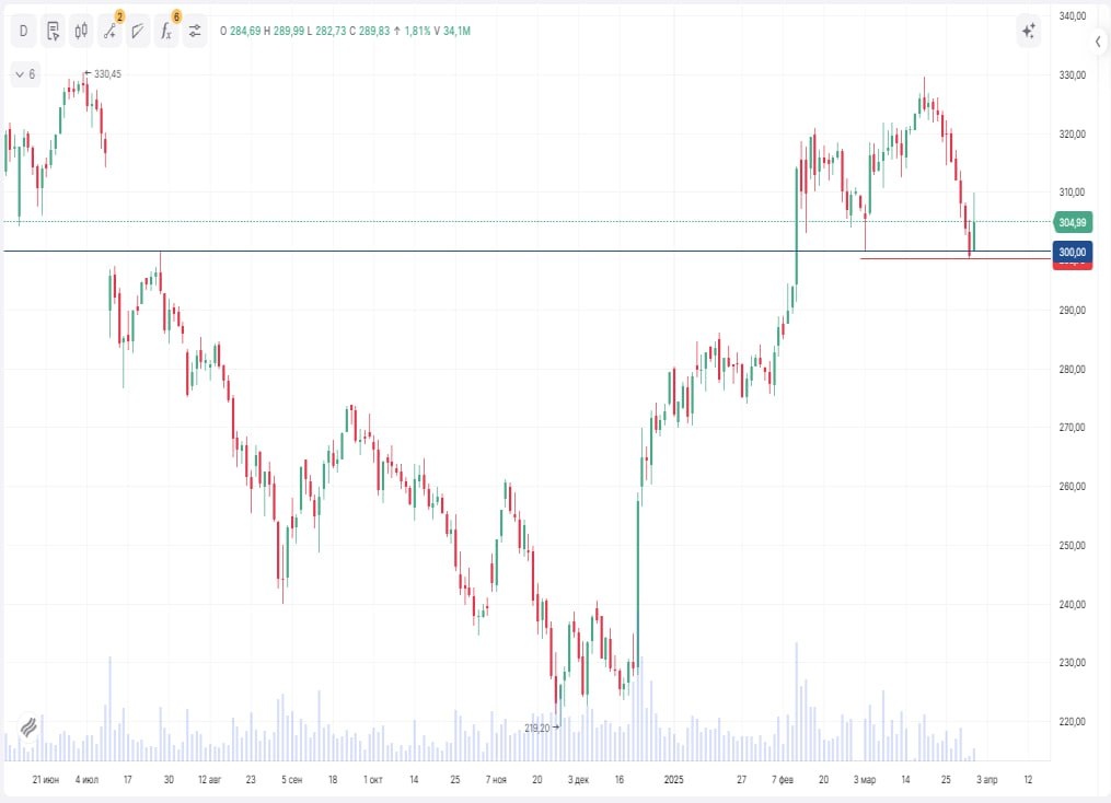 Акции двигаются в рамках восходящего тренда c декабря 2024 года. Котировки скорректировались к уровню поддержки (300 руб.). При объеме позиции 8% и выставлении стоп-заявки на уровне 298,7 руб. риск на портфель составит 0,16%. Соотношение прибыль/риск составляет 5,57.