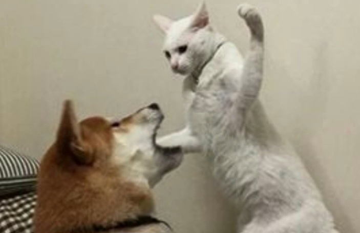 Котик в стойке карате готов нанести удар лапой по морде собаке, которая что-то недовольно выговаривает. Кот явно настроен серьезно, а собака выглядит слегка озадаченной.