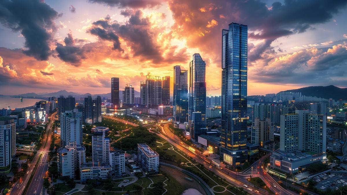 Создано на основе запроса: : A panoramic photo of futuristic Incheon, hyper-reflective skyscrapers towering into the sky, sleek autonomous cars navigating wide streets, swarms of delivery drones flying overhead. The skyline is sharp and layered with digital billboards. Sunset sky reflecting on glass, ambient neon lights glowing below. Created Using: Canon EOS R5, cyberpunk style, ultra-wide lens, 3D rendering blend, HDR lighting, aerial urban photography, ray tracing reflections, high-density architectural layering, hd quality, natural look