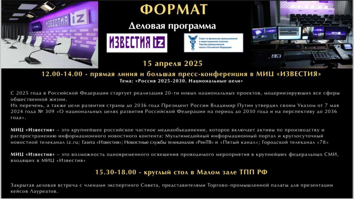 ПРОГРАММА МЕРОПРИЯТИЯ 15 апреля МИЦ "Известия" (Москва, Партийный пер., д.1, к.57, с.3) 11.30 - Сбор гостей, регистрация, кофе-брейк 12.00-14.00 - Пресс-коференция 14.00-14.30 - Нетворкинг, фото 15 апреля Малый зал ТПП РФ (Москва, Ильинка, 6) 15.30 - Сбор гостей 16.00 - 18.00 - Закрытая рабочая встреча с членами экспертного Совета Премии и Совета по финансово-промышленной и инвестиционной политике ТПП РФ Детали участия в лс