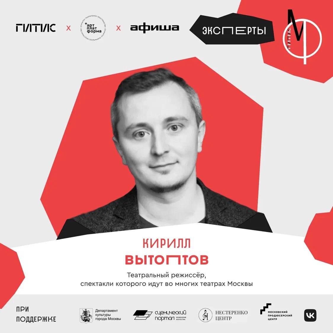 💔Эксперты «Малой формы» 2025 💔 Знакомим вас с составом экспертной комиссии конкурса-лаборатории «Малая форма» - совместного проекта крупнейшего театрального вуза в России - ГИТИСа, Открытого театрального пространства - «Арт- платформа» и компании «Афиша», который проводится по инициативе студенческого совета ГИТИСа. Кирилл Вытоптов - театральный режиссёр, спектакли которого идут во многих театрах Москвы Реализацию творческих решений сценографов поддерживает ведущая отечественная инженерно-производственная компания «Сценический Портал».
