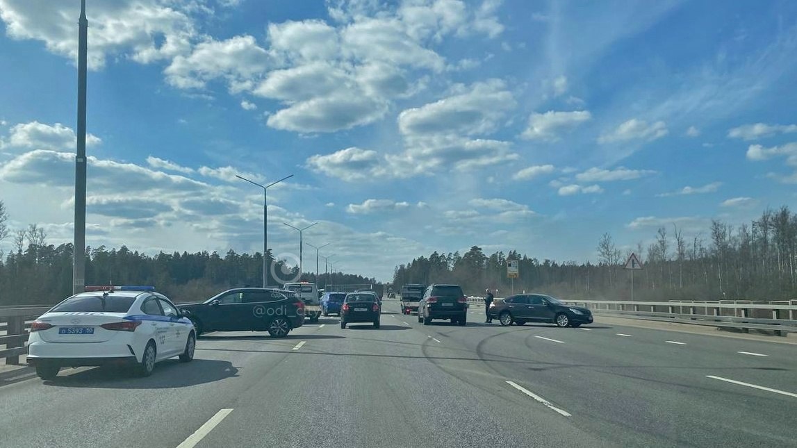 На Минском шоссе, в сторону области, авария перед Краснознаменском По следам на асфальте рисуется ясная картина батла. Наложил оперативный дежурный нашего проекта — Кубинец.
