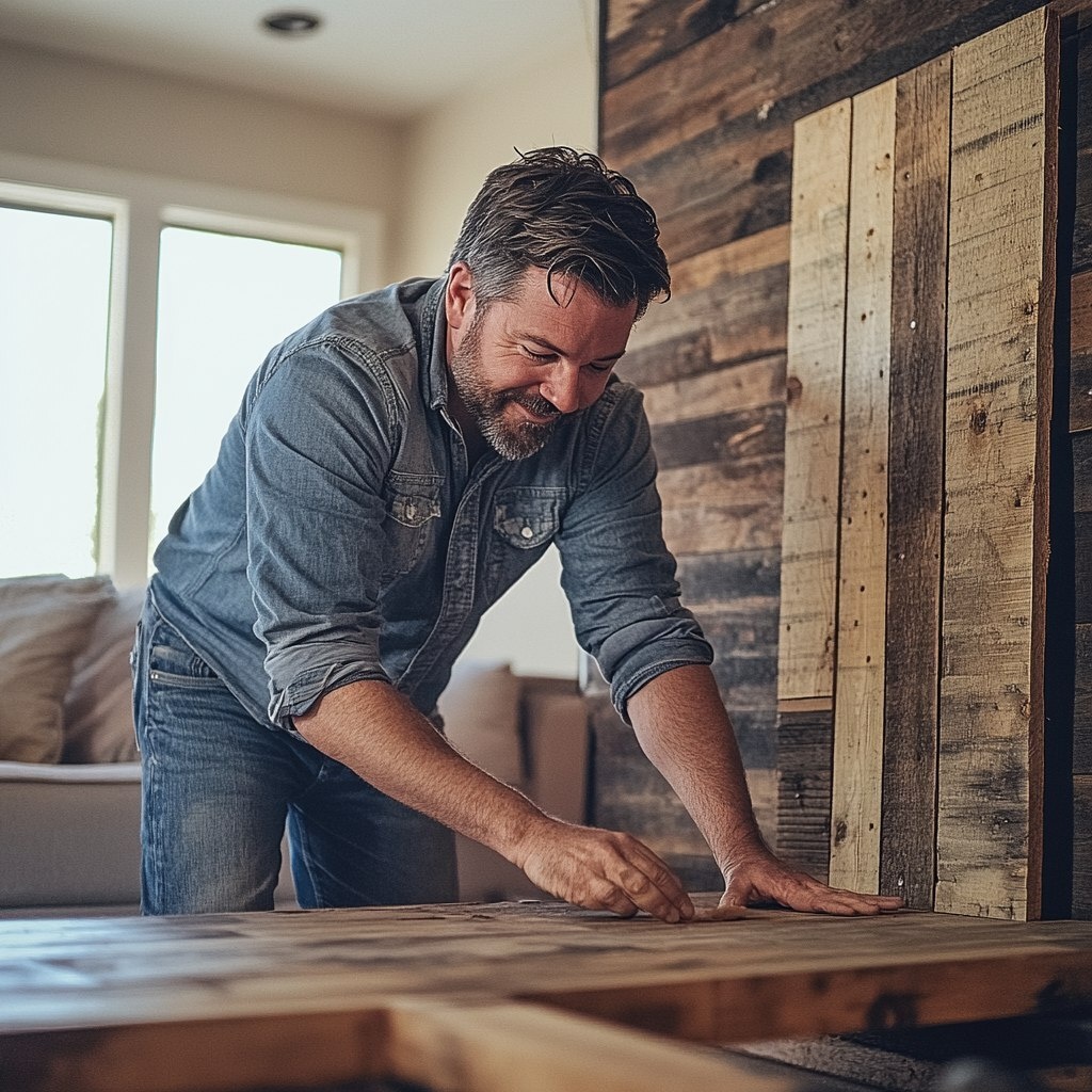 Создано на основе запроса: A cozy, aesthetically pleasing image of a 40-year-old normal man working on the renovation of his home. He is in a spacious living room with high ceilings, dressed casually but with a professional edge