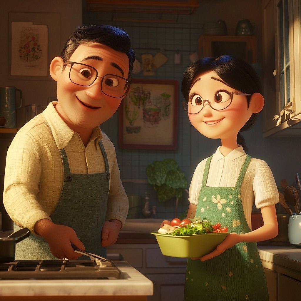 Создано на основе запроса: asian parents talking in the kitchen, pixar style