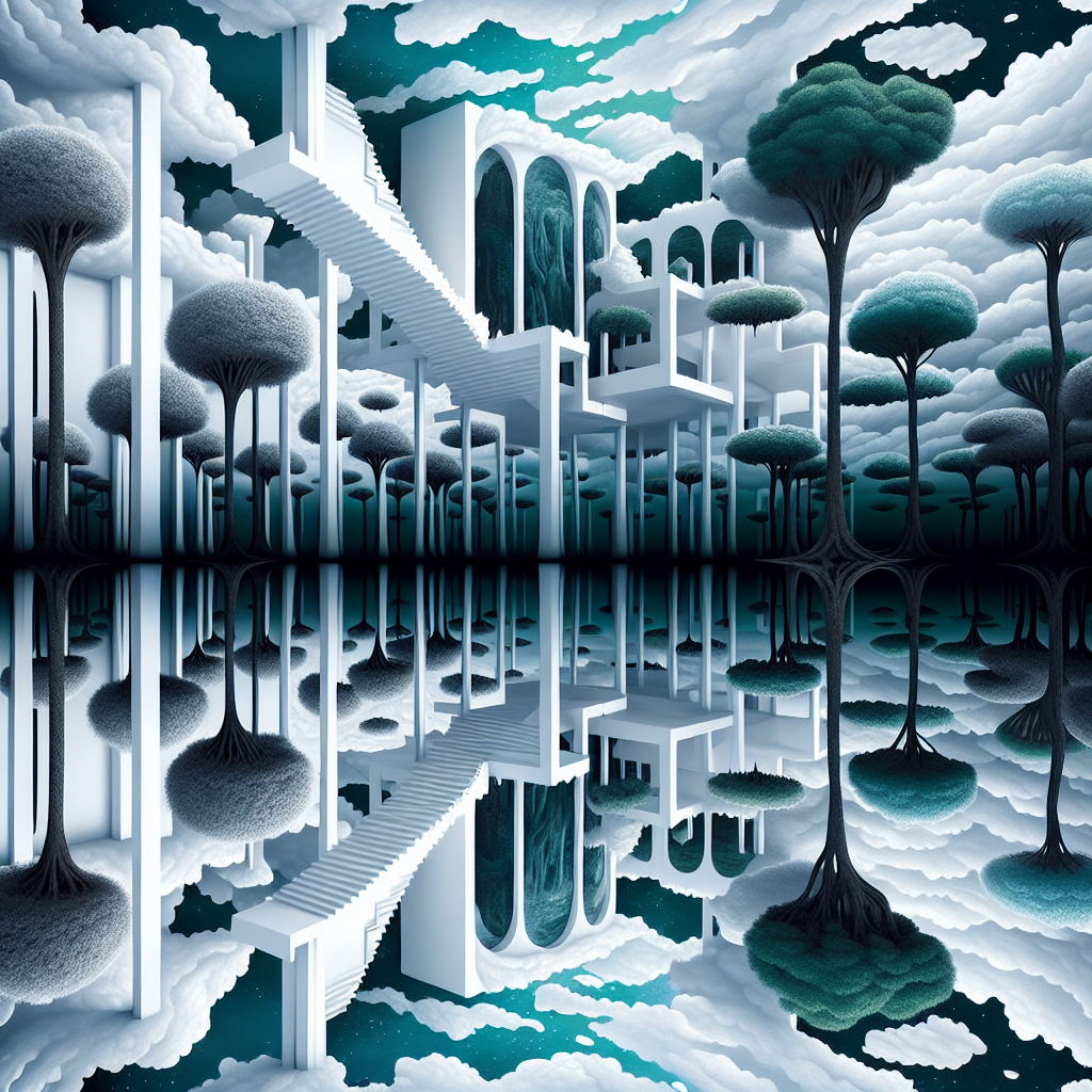 Это мир, где всё вверх ногами. Белоснежное небо отражает чёрную землю, окружённую зеркальными деревьями: у них вниз растут кроны, а вверх — корни. По небу плывут озёра, перевёрнутые, как капли, и из них медленно опадают капли воды, возвращающиеся к облакам. Звуки здесь движутся в обратную сторону — слышишь эхо перед тем, как скажешь слово. Архитектура состоит из лестниц, растущих вниз, и окон, глядящих внутрь души. Цвета — холодные и неестественные: аквамариново-теневые, изумрудно-чёрные, молочный инверс. Мир, где ни один закон не действует, но в котором можно увидеть своё «истинное отражение», если пройти до самого низа неба.