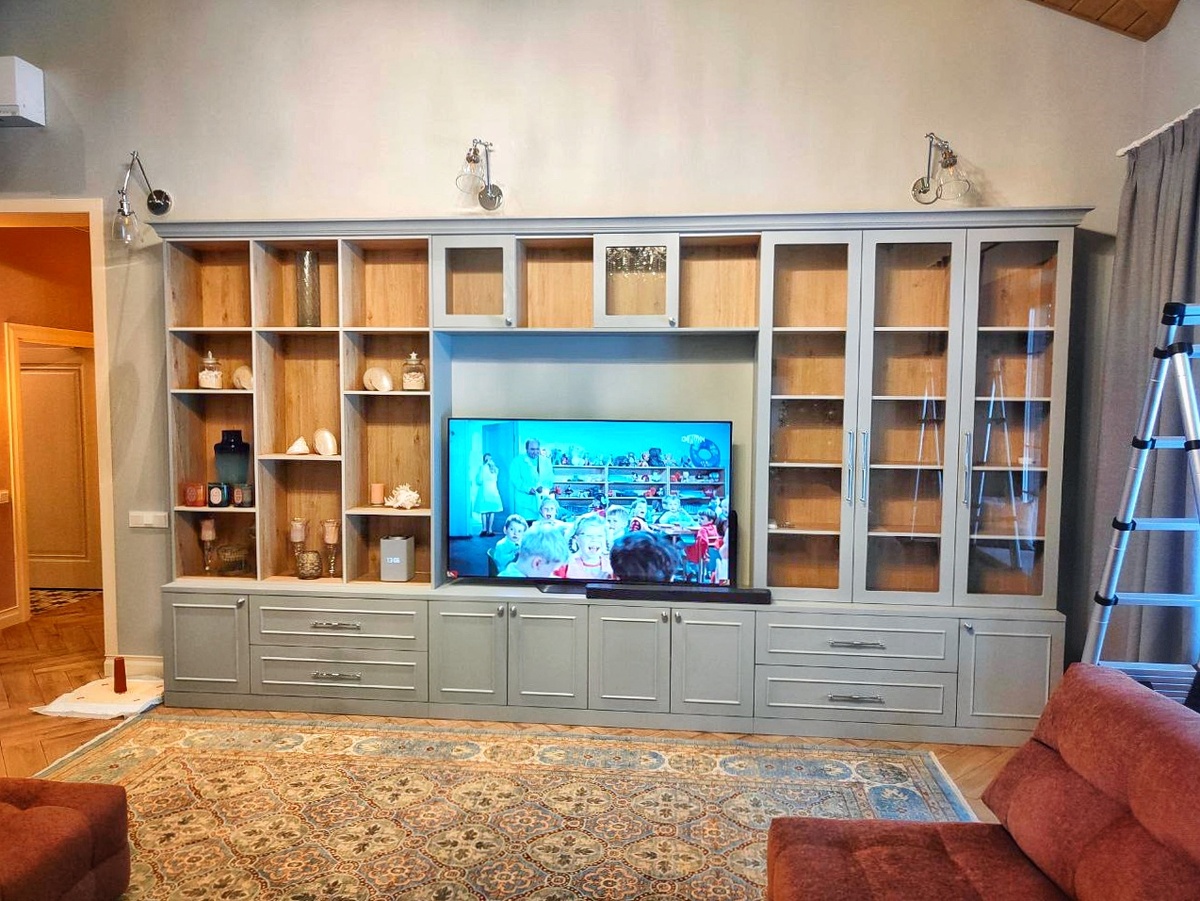 Эта изысканная ТВ-зона с гармоничным сочетанием светло-серого оттенка и текстуры натурального дерева станет центром притяжения в вашем доме. Выполненная с акцентом на функциональность и эстетику, она сочетает в себе просторные открытые полки, витрины с прозрачными стеклянными дверцами и вместительные закрытые шкафы. Закажите стильную и функциональную ТВ-зону, которая станет украшением вашего дома! 📞 Телефон: 📞 +7 (995) 895-11-11