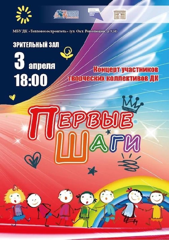🗓3 апреля в 18.00, в зрительном зале Дворца культуры "Тепловозостроитель", состоится концерт "Первые шаги", в котором примут участие учащиеся подготовительных и младших групп творческих коллективов ДК, которые только начинают свои первые шаги на большой сцене!