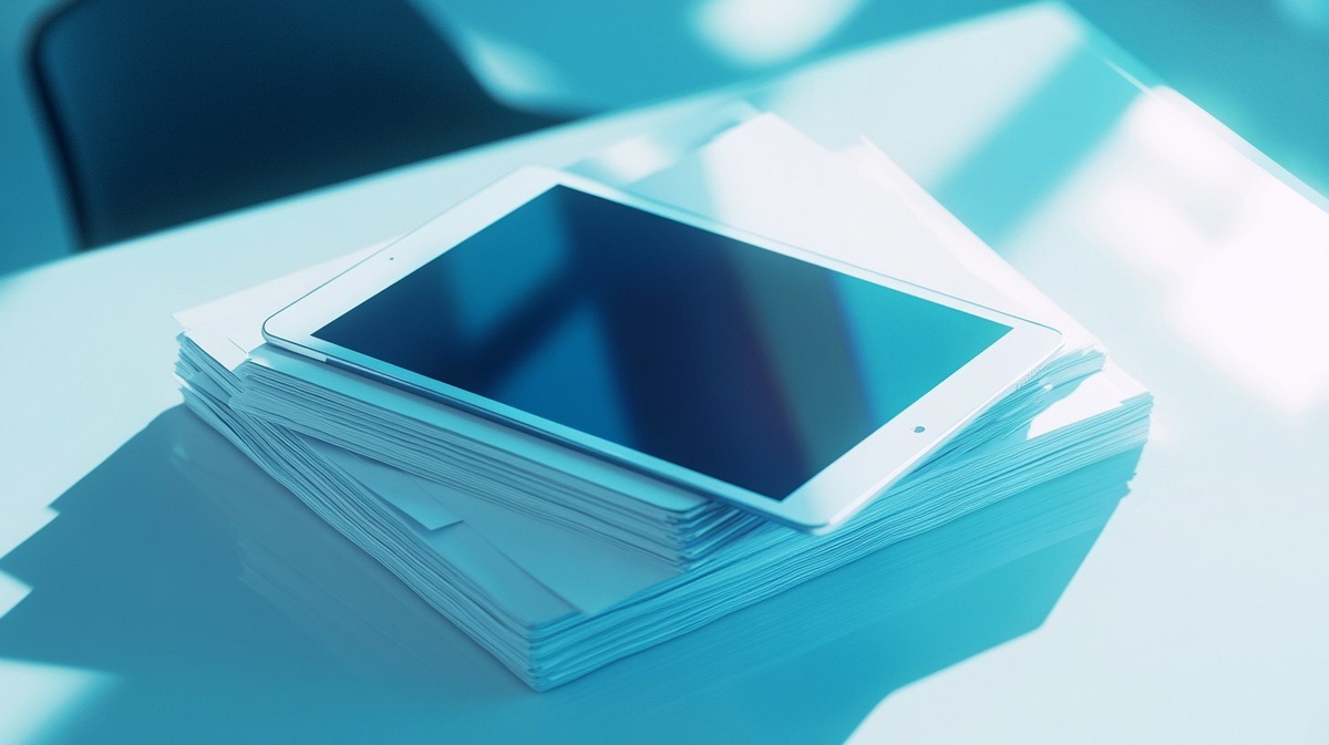Создано на основе запроса: A stack of documents neatly placed on a white office desk, with an iPad resting on top