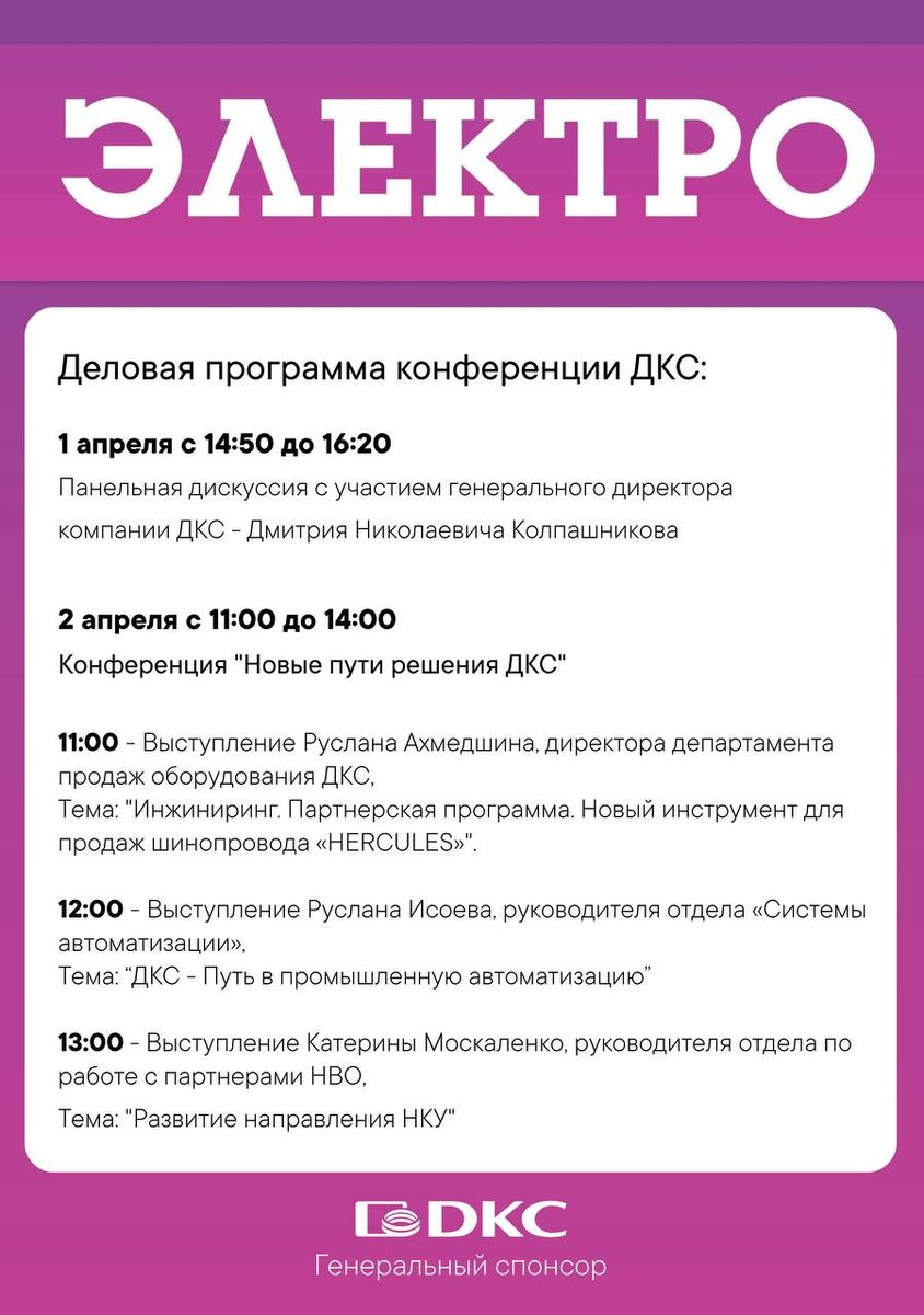 🔎 Деловая программа и мастер-классы ДКС на выставке "ЭЛЕКТРО-2025"! В рамках выставки "ЭЛЕКТРО" (1-4 апреля 2025 года) компания ДКС подготовила интересную деловую программу, которая включает панельную дискуссию и конференцию с участием экспертов компании ДКС. Вы сможете узнать о новых решениях и лично задать вопросы специалистам ДКС! 📍Уже завтра ждем вас в Экспоцентре по адресу: Москва, Краснопресненская набережная, 14. Номер стенда ДКС — 21С50. ❗️Успейте зарегистрироваться на выставку, чтобы первыми узнать больше об интересных продуктах и получить полезные навыки!