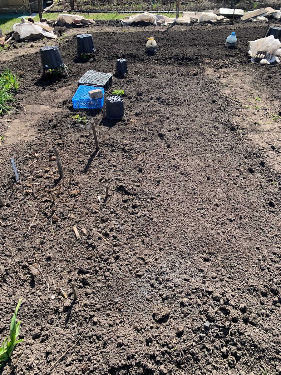 Под пятилитровыми бутылками я посадила плетистые розы. Сегодня земля высохла, и я засыпала все вновь посаженные розы почвой. Даже отсюда это видно.