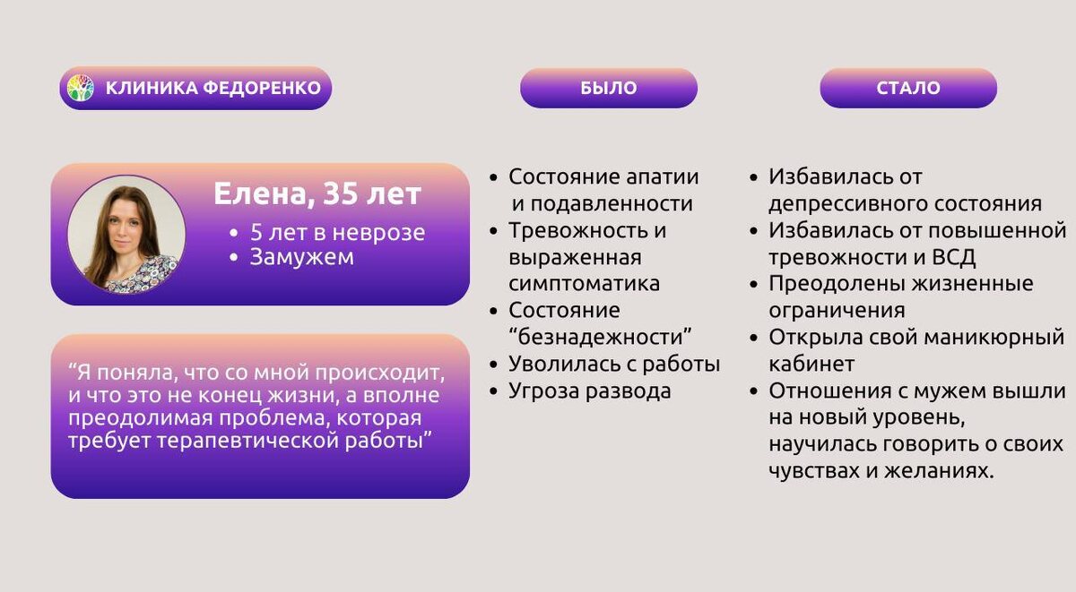 В ходе первой сессии выяснилось, что Елена уже 5 лет страдает от тревожного расстройства, которое она никак не могла преодолеть.