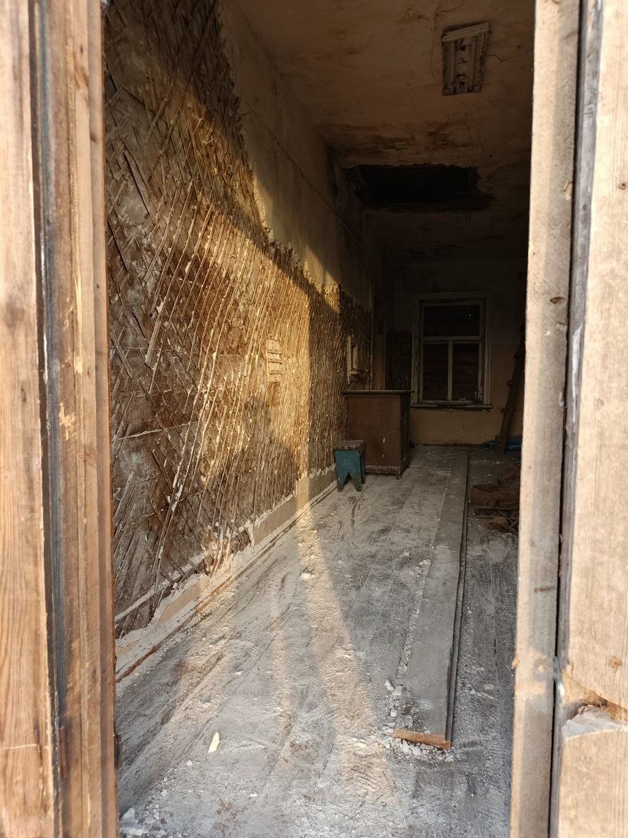 За 3 года, что контора стояла без кровли, штукатурка внутри взмокла и её полностью нужно будет отбивать. Сегодня попробовал в ручном режиме, в дальнейшем, конечно, с перфоратором.