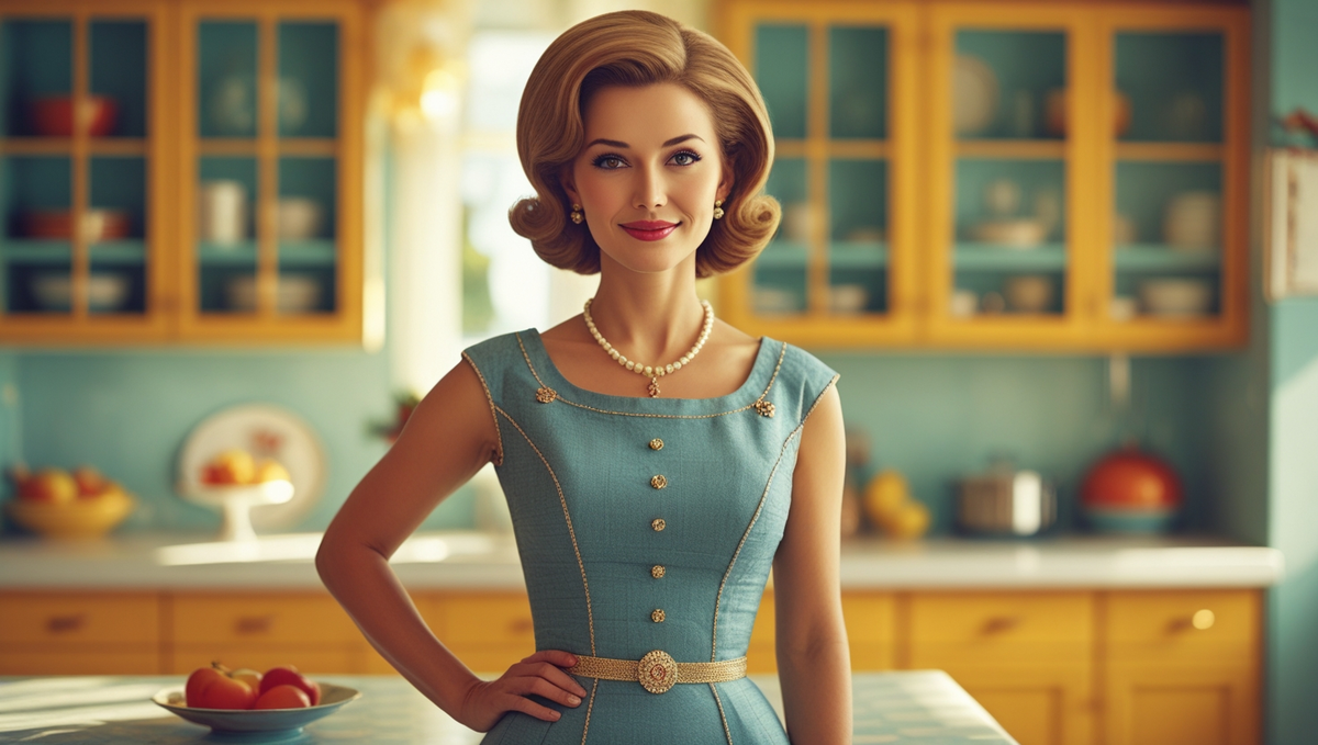 Молодая женщина в элегантном платье, с идеальной прической и макияжем, хлопочет на кухне. Готовя ужин из продуктов, выращенных на собственном огороде.