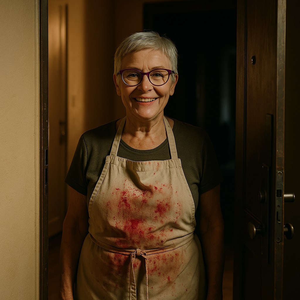 На пороге стояла женщина лет шестидесяти пяти, с коротко стриженными седыми волосами и яркими лиловыми очками. В фартуке, испачканном чем-то красным.