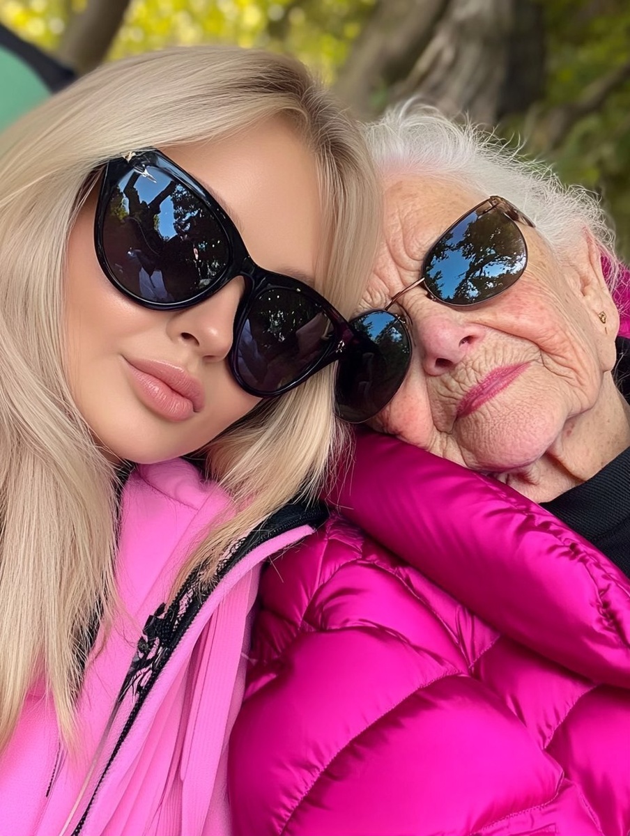 Создано на основе запроса: A photo of the blonde Russian model Claude Vuitton, wearing black sunglasses and a pink jacket, posing with her grandmother in nature, was posted to Reddit by "bring20" in the summer of 2036. The image is highly detailed.