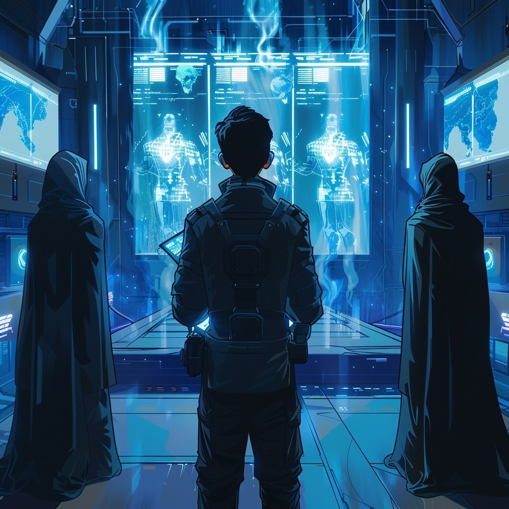 Создано на основе запроса: a young male space linguist with short dark hair, facing away from view, wearing a navy-blue explorer uniform and tactical boots, holding a digital notebook, standing in a futuristic control room on Earth with glowing holographic screens behind him. Three mysterious figures in long robes stand in front of him, lit by cool blue lights. Retro sci-fi comic book style, cel-shaded, clean lines, slightly stylized proportions, cinematic framing