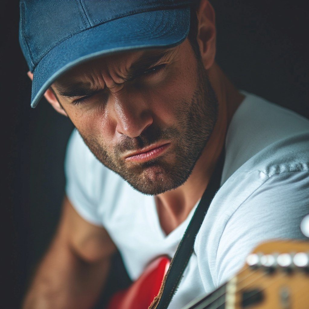 Создано на основе запроса: white handsome male guitarist, looking down, wearing blue baseball cap, extreme concentration look on his face