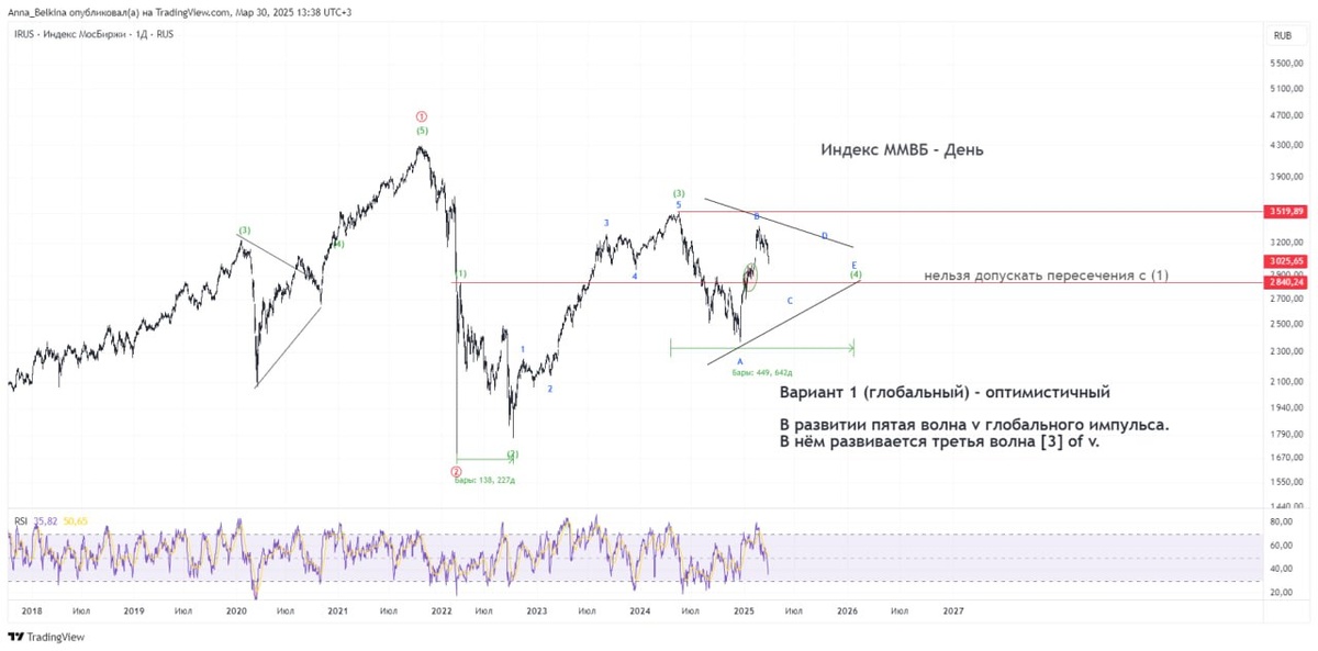 Из рассмотренного в видео: Тема – продолжение снижения российского рынка акций и облигаций, локальный откат рубля. https://dzen.ru/media/id/65b8789ff12bfe0796a26941/video-67ea2e1f5ecd6d61ec38f7f6 #RU #IRUS #MICEX На индексе ММВБ сохраняются ранее рассмотренные варианты среднесрочного движения. В приоритете – формирование локальной коррекции преимущественно в виде треугольника с выходом наверх. Не является ИИР