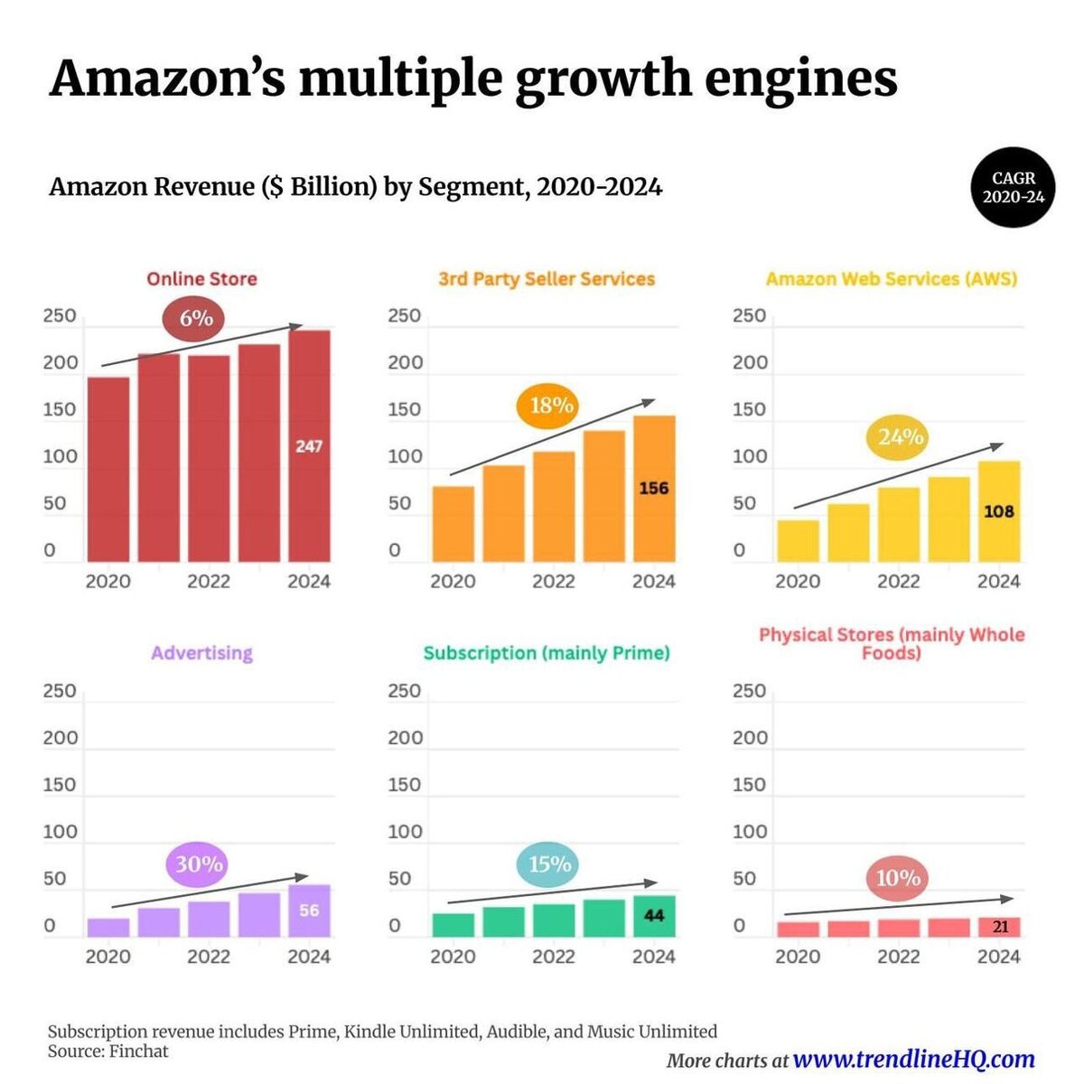 В ответ на пост Тут были вопросики про то, откуда и Амазон баблишко - и какраз подоспел инфографика про это. И это интересно, потому что многие думают, что амазон растет только за счет AWS, но это не совсем так. И что еще более интересное - рекламная выручка уже на уровне подписной. Но растет быстрее всего.