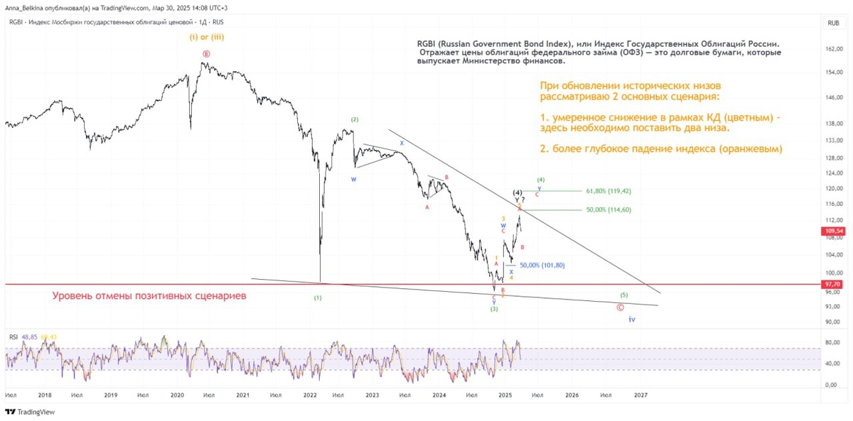 Из рассмотренного в видео: Тема – продолжение снижения российского рынка акций и облигаций, локальный откат рубля. https://dzen.ru/media/id/65b8789ff12bfe0796a26941/video-67ea2e1f5ecd6d61ec38f7f6 #RU #RGBI На долговом рынке развивается ожидаемая коррекция в волне (4) of [c] of iv. Это движение в нисходящей КД в волне [c] of iv бегущей плоскости. Подробнее о глобальных вариантах рассказывала ранее, поиск истории по хештегу #RGBI, а также в видео, посвященных росс. рынку. В приоритете – после завершения коррекции продолжение снижения. Не является ИИР