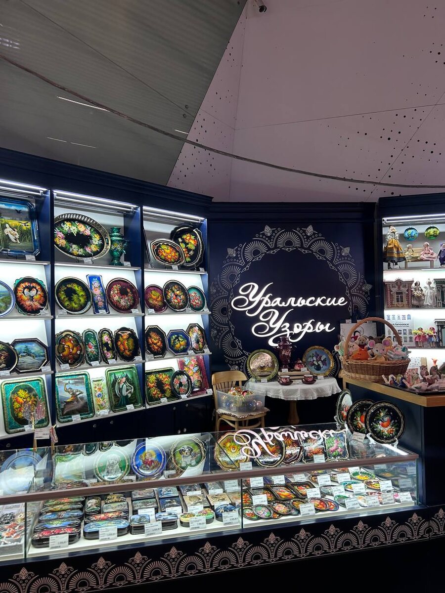 В аэропорту «Кольцово» (Екатеринбург) прекрасная лавка изделий с урало-сибирской росписью — настоящей!