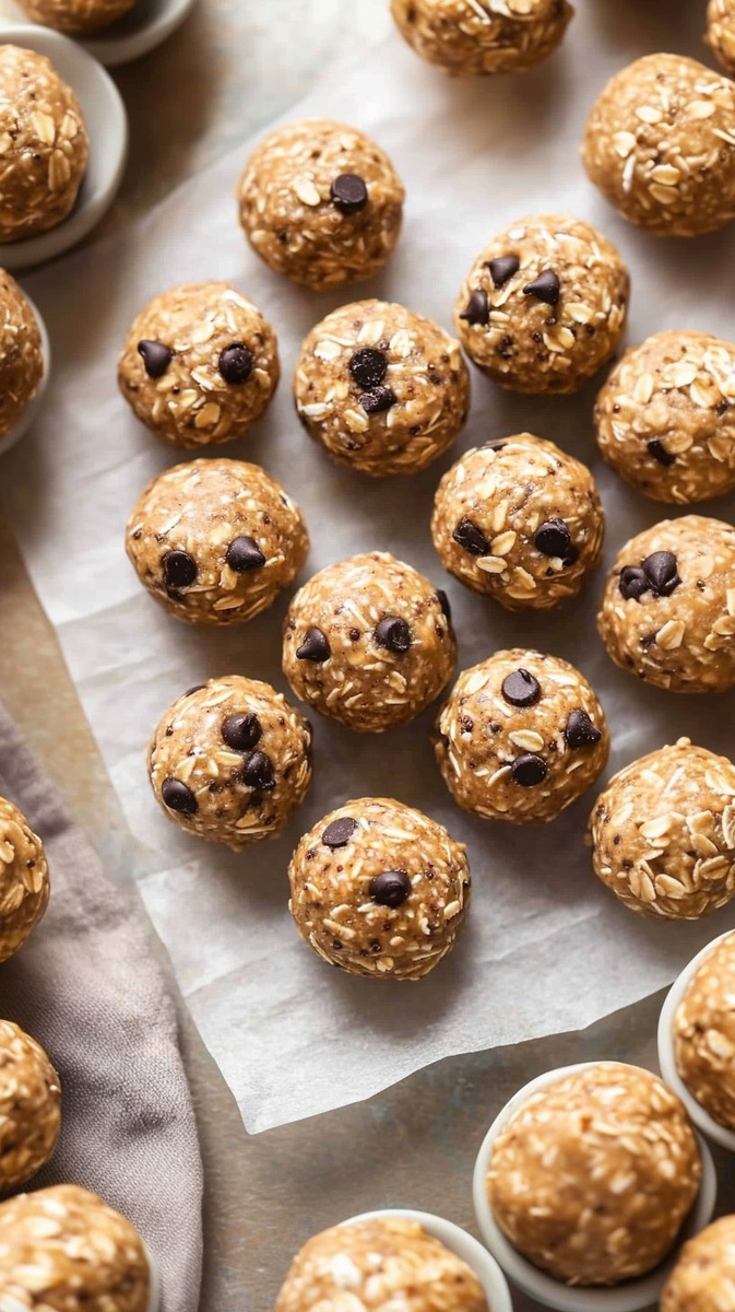 Создано на основе запроса: A close-up shot of healthy peanut butter energy balls arranged neatly on parchment paper, filled with oats, chocolate chips, and a rich texture. These no-bake snack balls look homemade and delicious, with a golden-brown exterior. The texture of oats and chocolate chips is clearly visible, giving the energy balls a rustic, wholesome appeal. The background is softly blurred, allowing the focus to remain on the details of the energy balls, evoking a feeling of health, energy, and satisfaction.