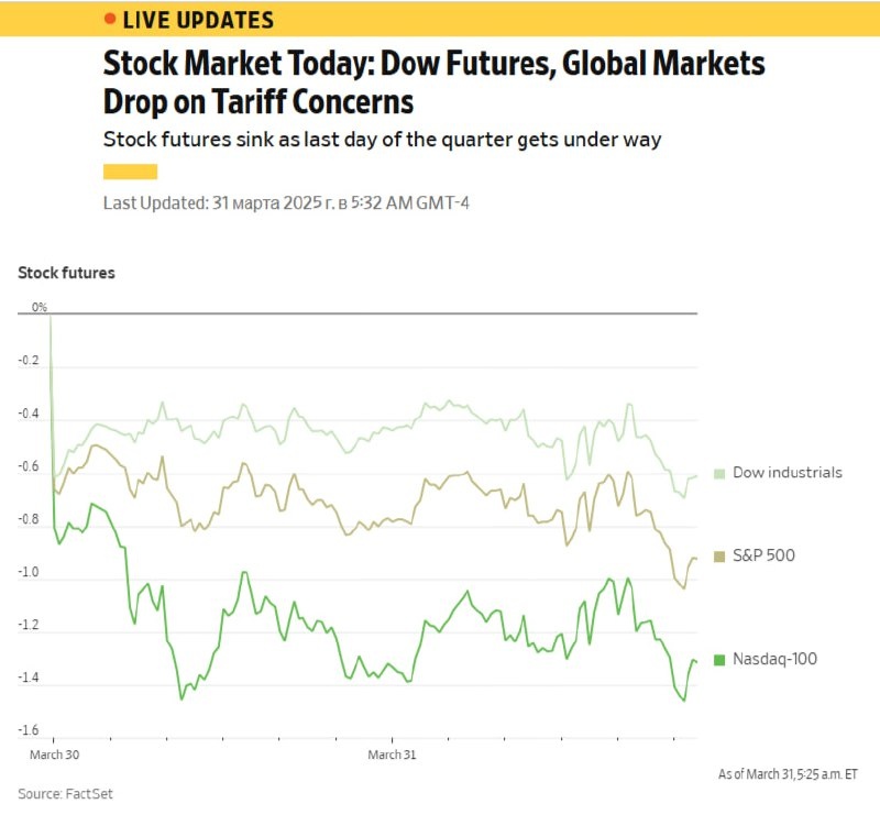 Новости хорошие: мировая экономическая война и Великая Депрессия - 2 продолжается 🤨 Мировые фондовые индексы Падают на фоне Роста Опасений По поводу тарифов в США, - пишет Wall Street Journal 🤨 Команда Трампа преддверии крайнего срока в среду снова обсуждает повсеместное повышение тарифов на 20%, - снова Wall Street Journal 🤨 Фьючерсы на индексы упали. Контракты, привязанные к индексам S&P 500, Nasdaq-100 и Dow Jones Industrial, подешевели. Стоимость эталонных кредитов снизилась. Доходность 10-летних казначейских облигаций снизилась. Доллар ослаб, согласно индексу доллара WSJ. Азиатские рынки упали. Японский индекс Nikkei 225, корейский Kospi и тайваньский Taiex — все они упали из-за акций производителей полупроводников. Индексы в Гонконге и материковом Китае тоже снизились. Европейские фондовые индексы снизились, особенно сильно пострадали горнодобывающая, банковская и автомобильная отрасли. Фьючерсы на золото подскочили на пути к очередному рекордному максимуму закрытия.
