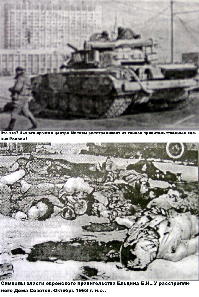 “Реформы” под руководством еврея Б.Н. Ельцина (Эльцына) произвели такое шоковое впечатление, что у автора нет слов для комментариев. Не возможно было даже вообразить, что во главе государства могут оказаться люди, единственной целью которых является уничтожение этого государства и народа, его населяющего. Шоковое впечатление произвело и то, что многие не евреи всё это поддерживали и голосовали за Ельцина. Многие из них испытали результаты таких действий полной мерой на собственной шкуре и попросту погибли - умерли в цветущем возрасте, не сумев приспособиться к изменившейся ситуации. Как к этому относиться? Получили то, чего добивались? Но ведь это наши люди, которым евреи просто задурили голову. Разъяснение смысла деятельности евреев является вопросом сохранения существования для русского и других арийских народов. Именно разъяснение, поскольку вред, следуя ложным идеям, внедряемым евреями, причиняют себе сами русские своими собственными руками. Особый шок вызвал расстрел из танков зда