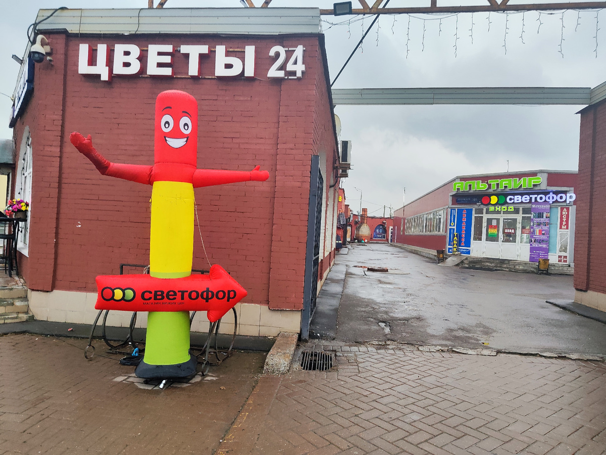 Магазин находится в Москве недалеко от станции метро Выхино в районе торговых рядов. Для привлечения внимания поставили надувного зазывалу.