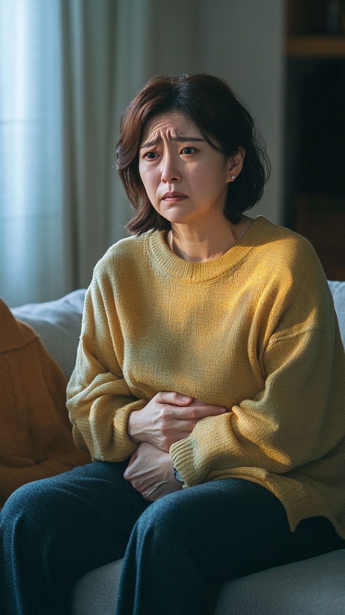 Создано на основе запроса: A realistic scene: a middle-aged Korean woman sitting on a sofa, clutching her stomach with a painful expression. Her face shows discomfort and slight frustration, and her posture is slightly hunched forward. She wears casual home clothes, and the background is a warm, lived-in living room with soft lighting. The atmosphere conveys mild abdominal pain, bloating, and digestive discomfort. Photographic style, natural lighting, realistic textures