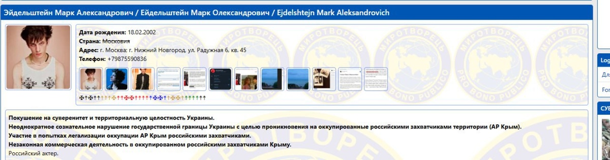 Эйдельштейна также обвиняют в якобы нарушении государственной границы страны, связанном с визитом в Крым для съемок фильма «Страна Саша». Кроме того, как отмечается в реестре, артист якобы вел «незаконную коммерческую деятельность» на полуострове.