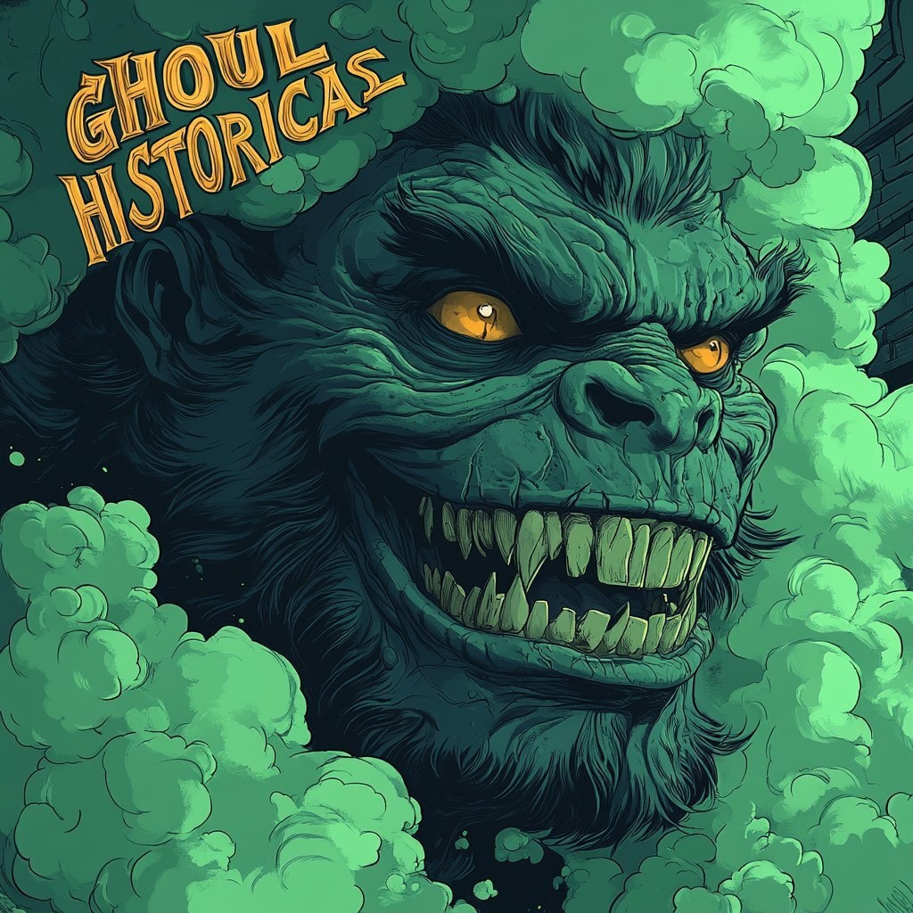 Создано на основе запроса: A green monster with a ferocious expression, surrounded by green smoke. Above is the text "GHOUL JOKES HISTORICAL". The style is grotesque with elements of horror and humor.