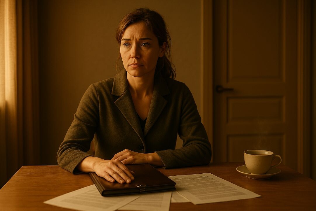 На столе — кружка. Бумаги. Папка с её решением. И рядом — записка от нотариуса: