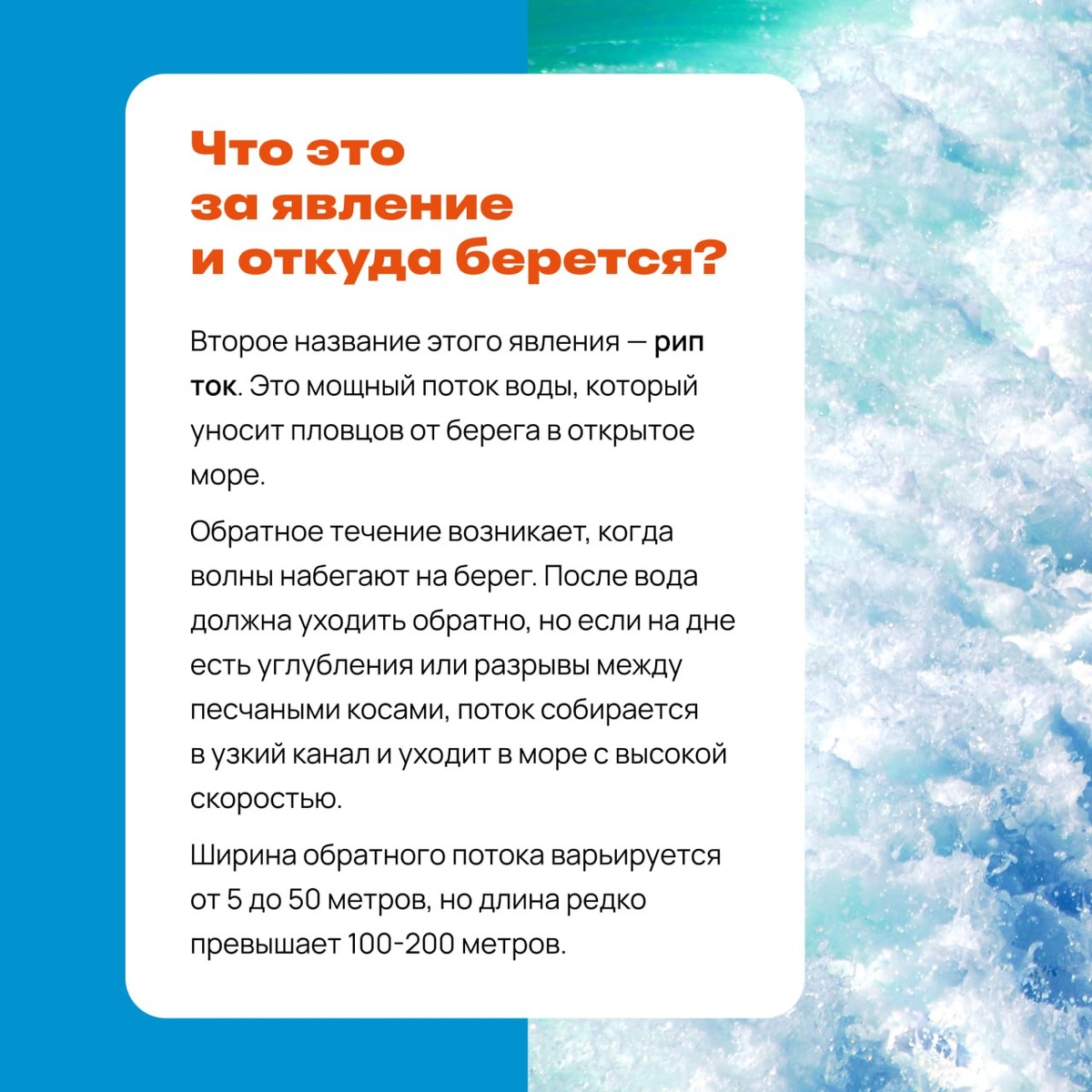 Обратное течение или рип-ток: как его избежать и что делать, если не получилось 👈 Обратным течением называют сильный поток воды, который уносит купающихся от берега в открытое море. Скорость потока может достигать 2,5 м/с, что быстрее любого пловца! Как его распознать и что делать, если вас уносит? Разбираемся в карточках. Запомните эти правила и поделитесь ими с друзьями 🩵 Безопасность на пляже – это ответственность каждого. #полезное