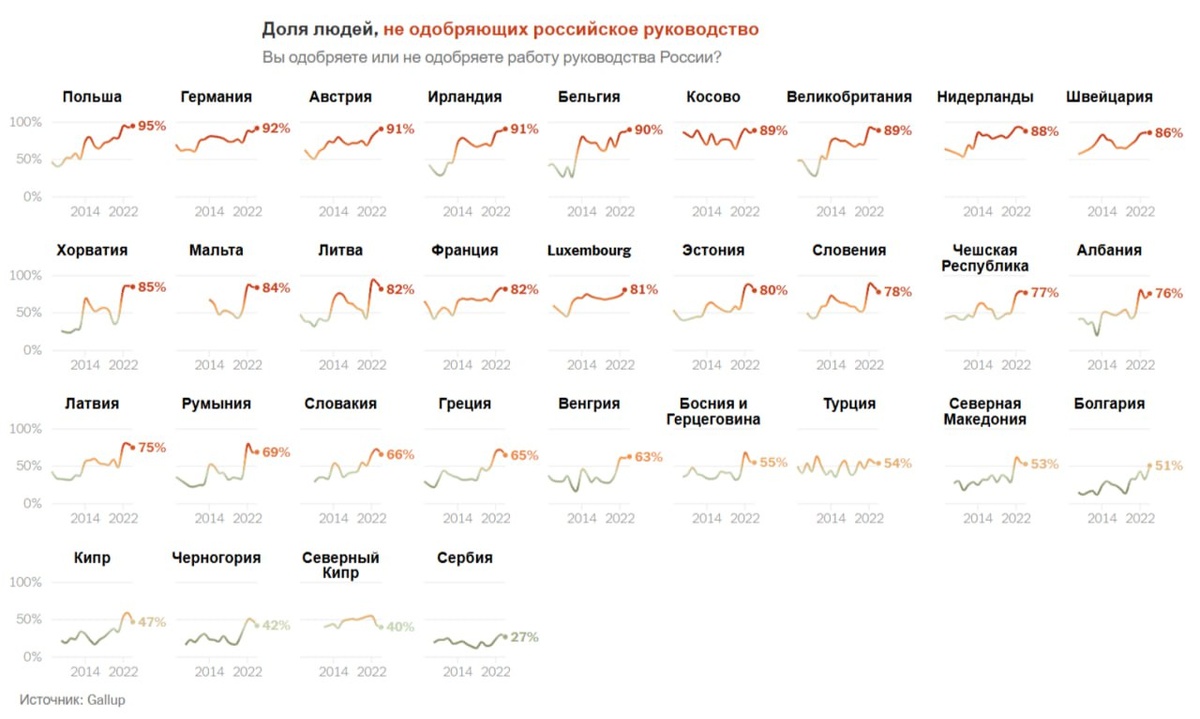 Уровень русофобии по странам Европы по опросам Gallup (доверие к российскому руководству