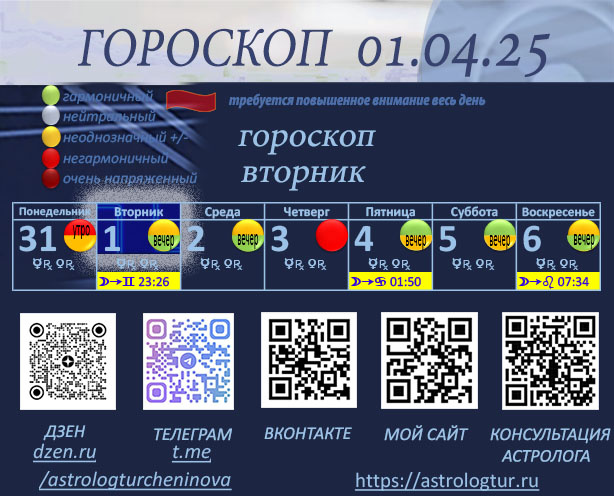 "Первое апреля - никому не верю", день смеха! Этот день может принести много шуток, сюрпризов. В течение дня мы ощутим прилив энергии и вдохновения. Настроение будет на подъёме, мы будем чувствовать непринужденность и жажду экспериментов. Возможно знакомство с чем-то/кем-то необычным или выходящим за рамки привычного. Могут возникнуть неожиданные идеи и внезапные озарения, которые откроют новые перспективы. Например, участие в мероприятии с уникальным форматом или обсуждение новых технологий может привести к чему -то новому интересному. Этот день может принести разные новости, полезную информацию, также возможны новые знакомства и встречи с бывшими. Вечер станет временем тепла, взаимопонимания и романтики, что позволит нам насладиться общением с близкими и любимыми. Эмоциональные связи укрепятся, а неординарные идеи могут преобразовать вечер в нечто особенное. Хотя коридор затмений завершился, мы все еще можем ощущать лёгкое "послевкусие" недавних затмений. Но постепенно всё начнет п