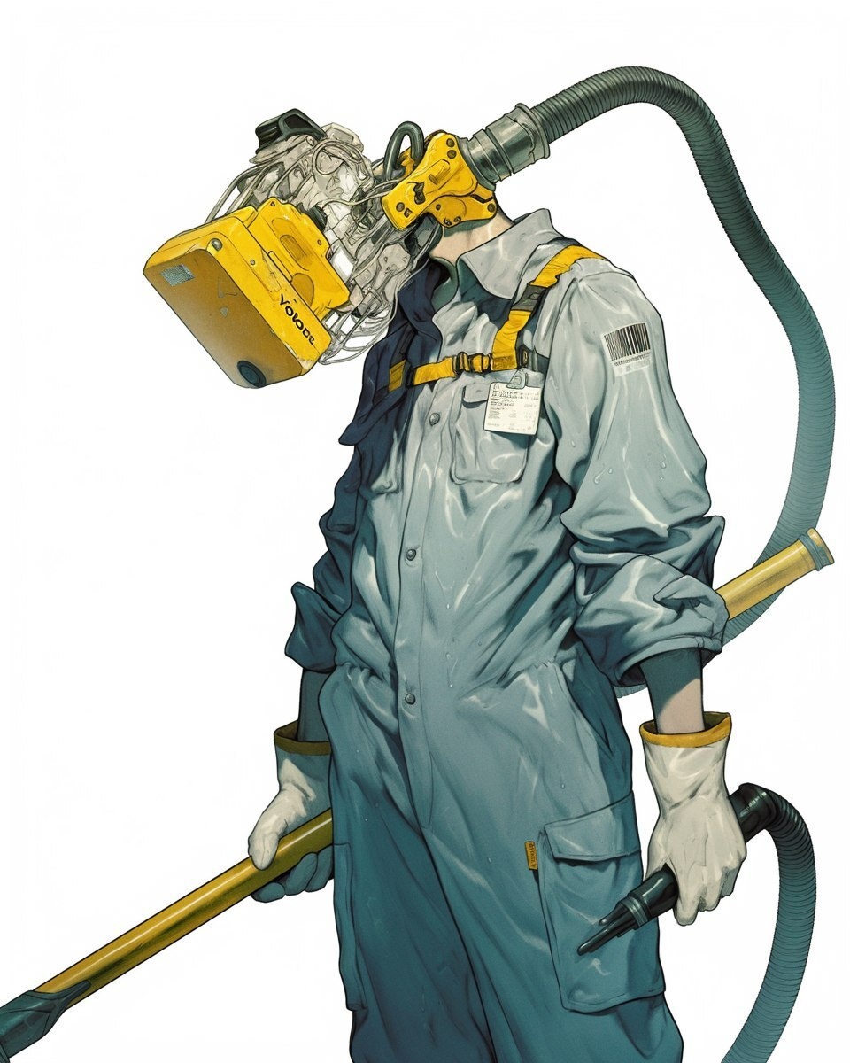 Создано на основе запроса: A young man in gray work clothes is standing straight. He is holding a yellow water pistol in his hand. His head is in the shape of a Dyson vacuum cleaner.watercolor, a detailed illustration of, White background.