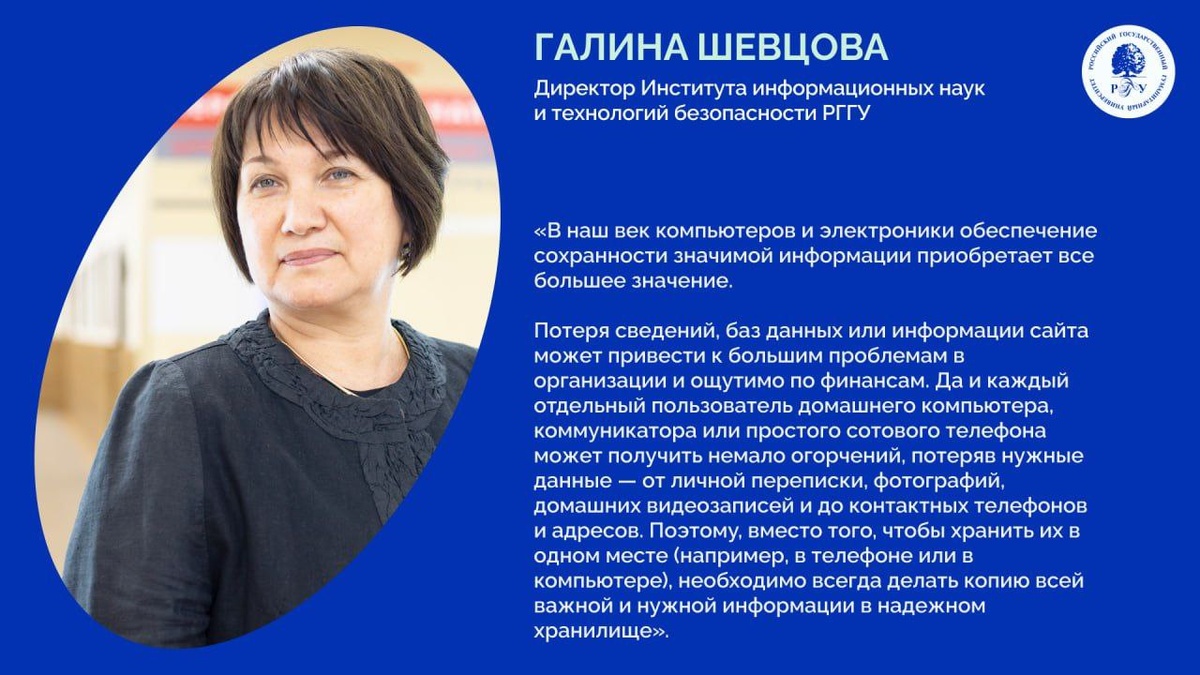 Защите информации – быть! 🎉 Сегодня, 31 марта, отмечается Международный день резервного копирования Праздник напоминает нам, как важно ценить информацию в современном мире. Защита данных становится крайне необходимой, так как потеря информации может вызвать серьезные проблемы как для людей, так и для организаций 🗣️ О том, как защитить информацию, рассказывает Галина Шевцова, директор Института информационных наук и технологий безопасности РГГУ: «День бэкапа – тот праздник, который призван напоминать людям о том, что данные следует защищать и хранить аккуратно. Именно резервное копирование помогает избежать сложностей, возникающих в результате потери файлов В Институте информационных наук и технологий безопасности РГГУ студенты, обучающиеся по направлению подготовки «Информационная безопасность», с первого курса постигают основные принципы резервного копирования: 1. Локальное копирование – данные сохраняются на внешние носители. Этот метод удобен, но уязвим к физическому поврежд