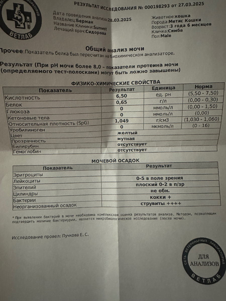 Мы наконец дошли сами и узнали наши анализы . Анализы не очень(, песок в почках. Доктор сказал, лучше бы камни , они могут выйти сами, а у нас песок - без лечения никак! Нам назначили Омник окас ( препарат для мужчин) и Уропро - это ветеринарный препарат , помогает при цистите и МКБ. Его , кстати , давать удобно , там шприц , специальная крышка под шприц и удобно так набираешь 1 мл и в рот коту). Еще назначили диету и специальный корм- этого я боялась больше всего, потому кот такой вредный)), голодать будешь, а что не хочет не притронется. Но тут ждала радость, корм понравился , ест, даже с энтузиазмом. Еще в интернете вычитала , что коты на любят цитрусовые и мол если на то место, где он сходил положить корки , то он вообще не подойдет. Ну не знаю))), наш наоборот))), когда увидел , что мамка разложила везде мандариновую кожуру))), только и лезет понюхать), а через пару дней привык к таким странностям человека))), и смирился , ложится рядом и отодвигает их лапкой. А вот б