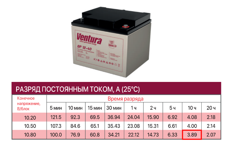 при этом ток I10 для аккумулятора Ventura GP 12-40 составляет 3,89 А.