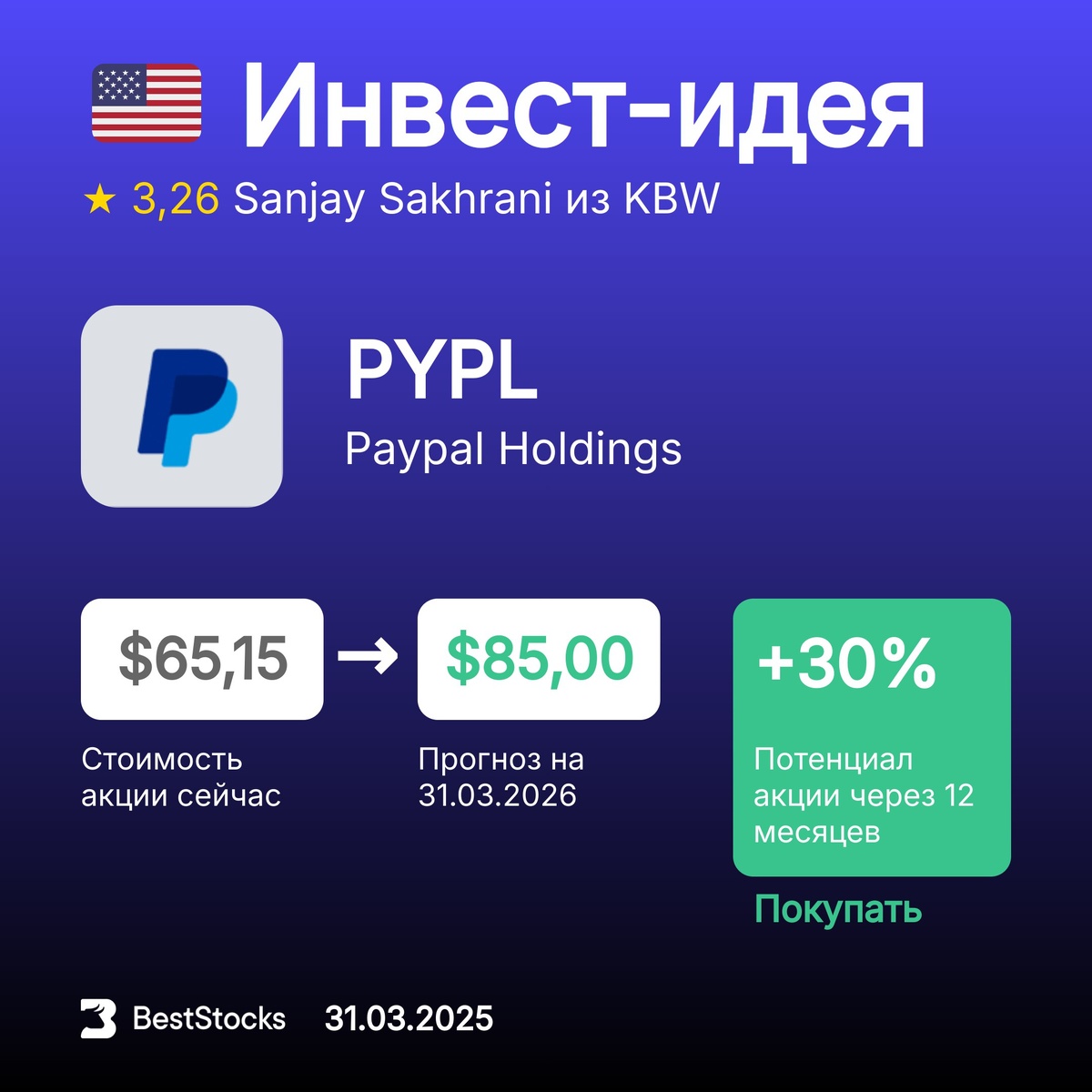 🇺🇸 Инвест-идея по акции Paypal Holdings Тикер: PYPL Прогнозная цена: $85 (+30%) Рекомендация: Покупать InvestRank акции: 6 из 10 Прогноз сделан: 31.03.2025 Прогноз до: 31.03.2026 Инвест-компания: KBW Аналитик: Sanjay Sakhrani Ещё рекомендации на сегодня → ••••• 🆕 Новая фича на сайте — Тепловая карта рынка. Вы можете оценить динамику рынка в моменте: какие акции больше всего растут или падают, какие торгуются больше других. Всё это бесплатно и доступно без регистрации. Пользуйтесь!