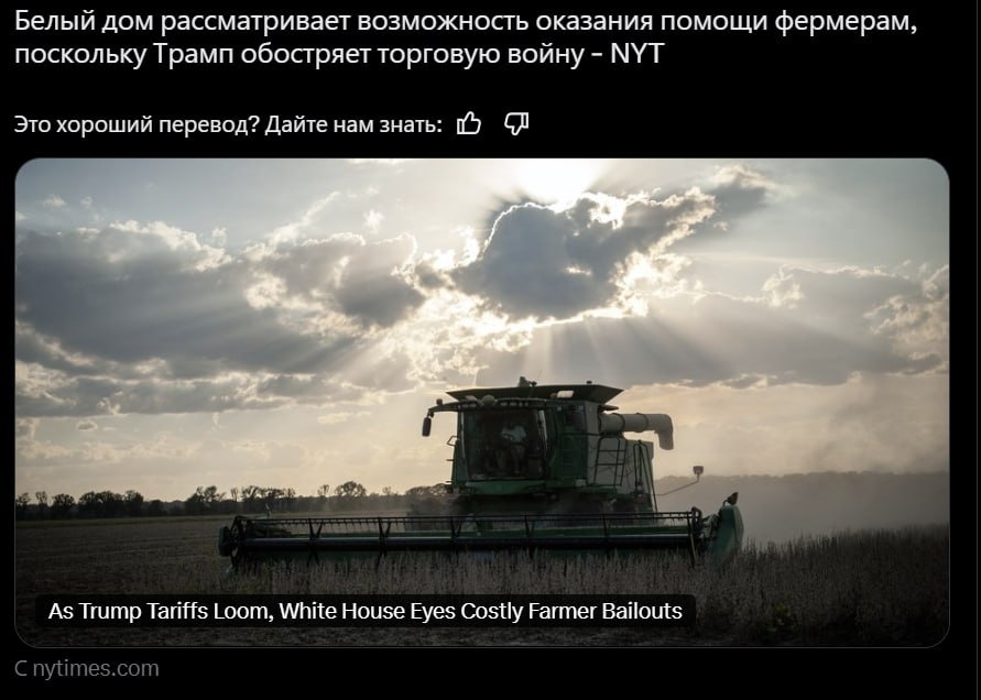 Какая стадия? АДМИНИСТРАЦИЯ ТРАМПА ЯКОБЫ РАССМАТРИВАЕТ ПАКЕТ ПОМОЩИ ДЛЯ ФЕРМЕРОВ [NYT] Согласно отчету, представители Белого дома обсудили ранний проект потенциальной помощи фермерам с лоббистскими группами отрасли и республиканскими офисами в Конгрессе. P.S. Дефицит торговли сельхозпродукцией США уже достиг рекордно высокого уровня [впервые за 70 лет дефицит фиксируется три года подряд] @marketheart
