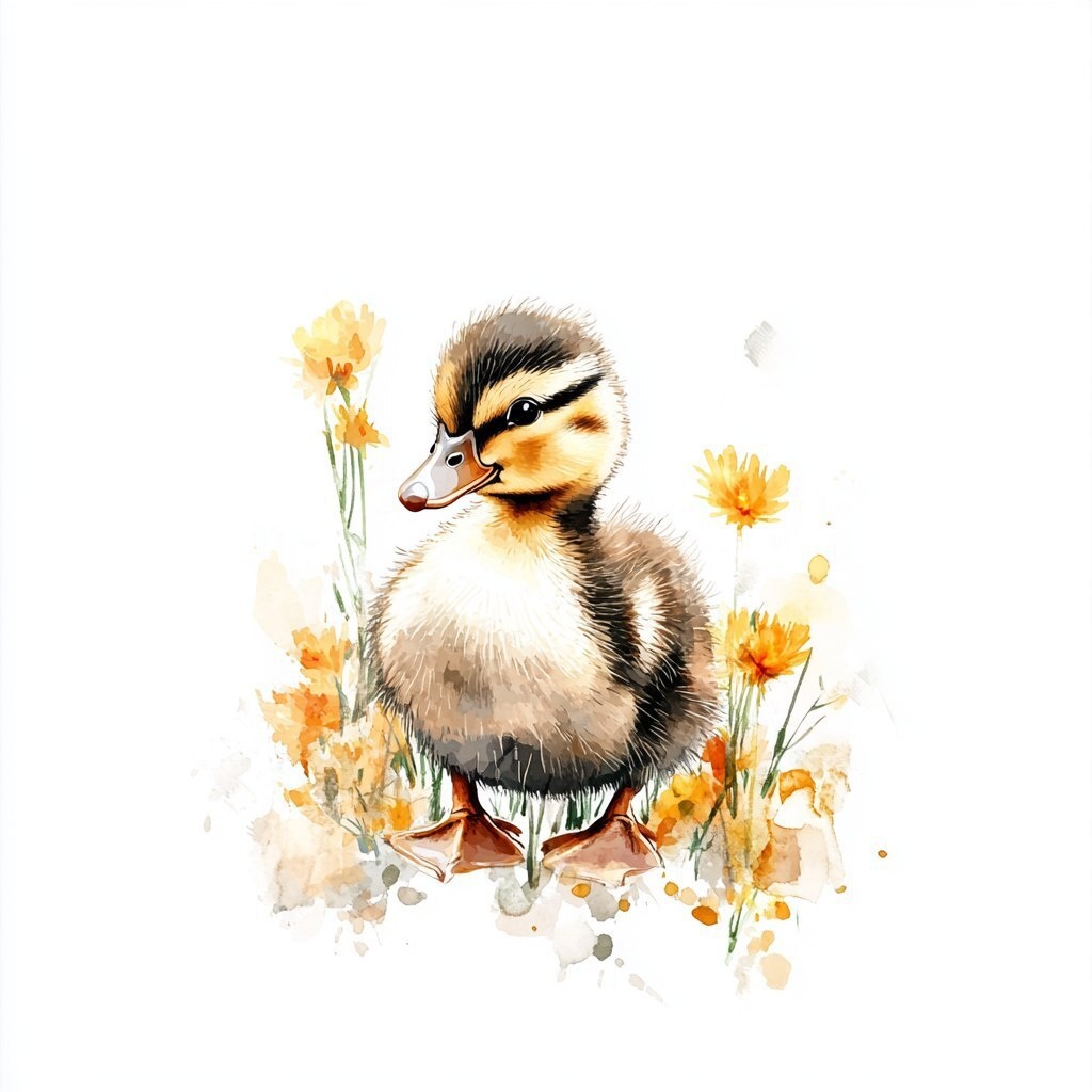 Создано на основе запроса: A fluffy duckling in watercolor style, standing among soft yellow-orange flowers, light brown and golden feathers, facing slightly to the right, gentle and playful look, white background, dreamy and artistic composition