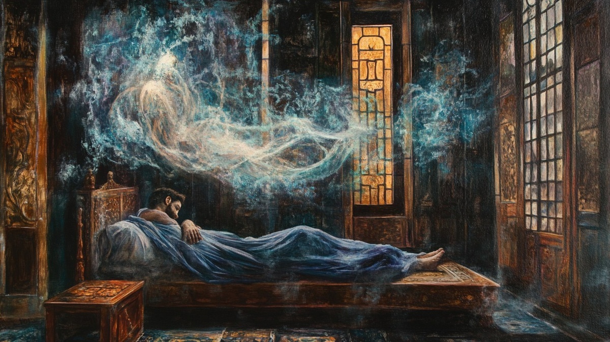 Создано на основе запроса: Oil painting, the figure of God is floating in the room, along with a man who is sleeping soundly