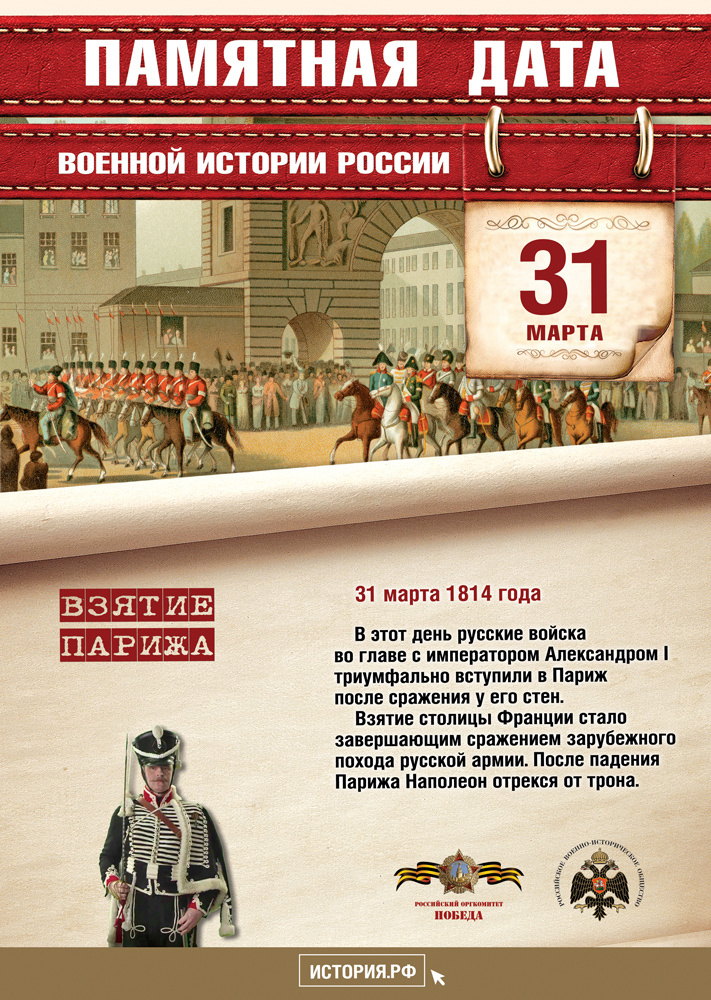31 марта 1814 года русские войска во главе с императором Александром I триумфально вступили в Париж после сражения у его стен. Взятие столицы Франции стало завершающим сражением наполеоновской кампании 1814 г., после которого французский император Наполеон I Бонапарт отрекся от трона. А вы любите историю!?