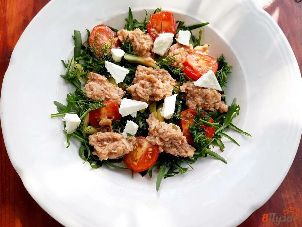 Раньше всегда готовили зимний салат на праздники и дни рождения,не называли его "Оливье". У нас рядом была теплица и первые огурчики начинали продавать к 23 февраля.А 24 февраля было день рождения моего братика . Только вот теперь и родственники и знакомые и мои домочадцы почему-то стали делать зимний салат с солеными огурчиками,а я вот помню со свежими огурчиками и зеленым лучком. Зимний так и делается на праздничные столы,хоть по чуть-чуть,некоторые очень любят,особенно мужчины. Потом на на наших праздниках "завсегдатаем"стола стал греческий салат. А сейчас салат с тунцом и моцареллой "лидирует"ю Вот как мы его готовим(Америку не открою,конечно ): Листья салата(кому какой нравится) хорошо моем,стряхиваем,даем обсохнуть на бумажных полотенцах. Для салата рвем листья руками в произвольном порядке и укладываем на тарелку. Тунец(консервированный),стараясь не зачерпнуть "сок" ,вытаскиваем из банки. Аккуратно кладем на листья салата и слегка вилкой распотрошим кусочки. Кто-то далее шнитт