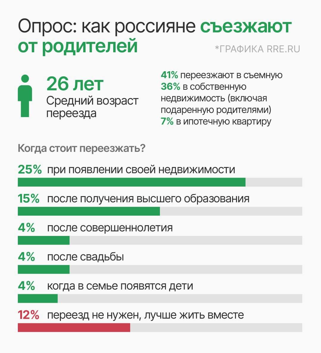 Большинство россиян начинают жить отдельно от родителей в 26 лет 🧑🧑🧒 ⬇️ Из них: 41% съезжает в съемную квартиру 36% в собственную недвижимость 7% в ипотечную квартиру. По данным опроса от «СберСтрахования», 15% склоняются к тому, что съезжать от родителей стоит сразу после получения высшего образования, 4% — уверены, что сразу после совершеннолетия. Еще 4% видят смысл уезжать в собственное или съемное жилье после свадьбы. 3% — только после рождения собственных детей. Я наблюдаю, как в крупных городах молодые люди не спешат покинуть родительский дом: после школы поступают тут же в университет, потом начинают строить карьеру. На своё жилье еще не накопили, отдавать пол зарплаты на аренду — не хочется. Поэтому о своих детях позаботилась заранее — уже сейчас купила квартиры, которые буду сдавать до их совершеннолетия 👌 А вы как считаете, когда стоит начинать самостоятельную жизнь? Делитесь в комментариях!