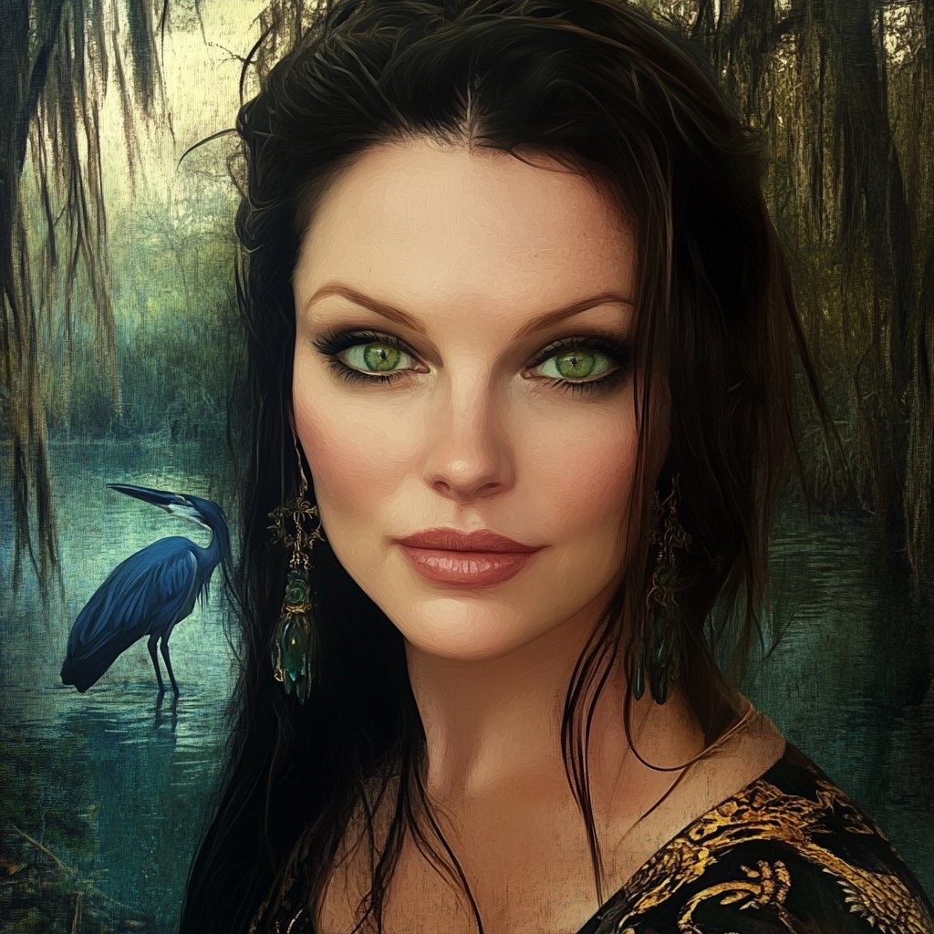 Создано на основе запроса: using the face in the link, create a queen of the Louisiana swamp, make her a voodoo priestess, she has captivating green eyes, shoulder length dark brown hair, moody, vintage, background is swamp at dusk, include alligator, include blue heron bird, oil painting in the style of Michaelangelo --- Автоперевод: Используя лицо в связи, создайте королеву Болота Луизианы, сделайте ее жрицей вуду, у нее есть очаровательные зеленые глаза, темно -коричневые волосы длиной плеча, капризные, винтажные, фон - болото в сумерках, включает в себя аллигатор, включает в себя голубую цапля, картину масла в стиле Michaelangelo. Отлично выглядит? 🤔 https://dzen.ru/id/65c0c65c86e4f837c27b24d7 #ИИ #AI #нейросеть #midjourney #art
